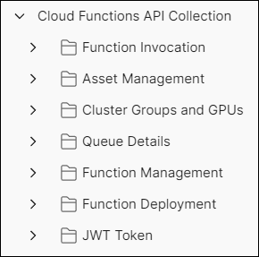 Within Postman, use an existing workspace or create a new one, and then import the NVCF Postman Collection file that was downloaded during the previous step. This will display the Cloud Functions API Collection within the workspace as shown below: