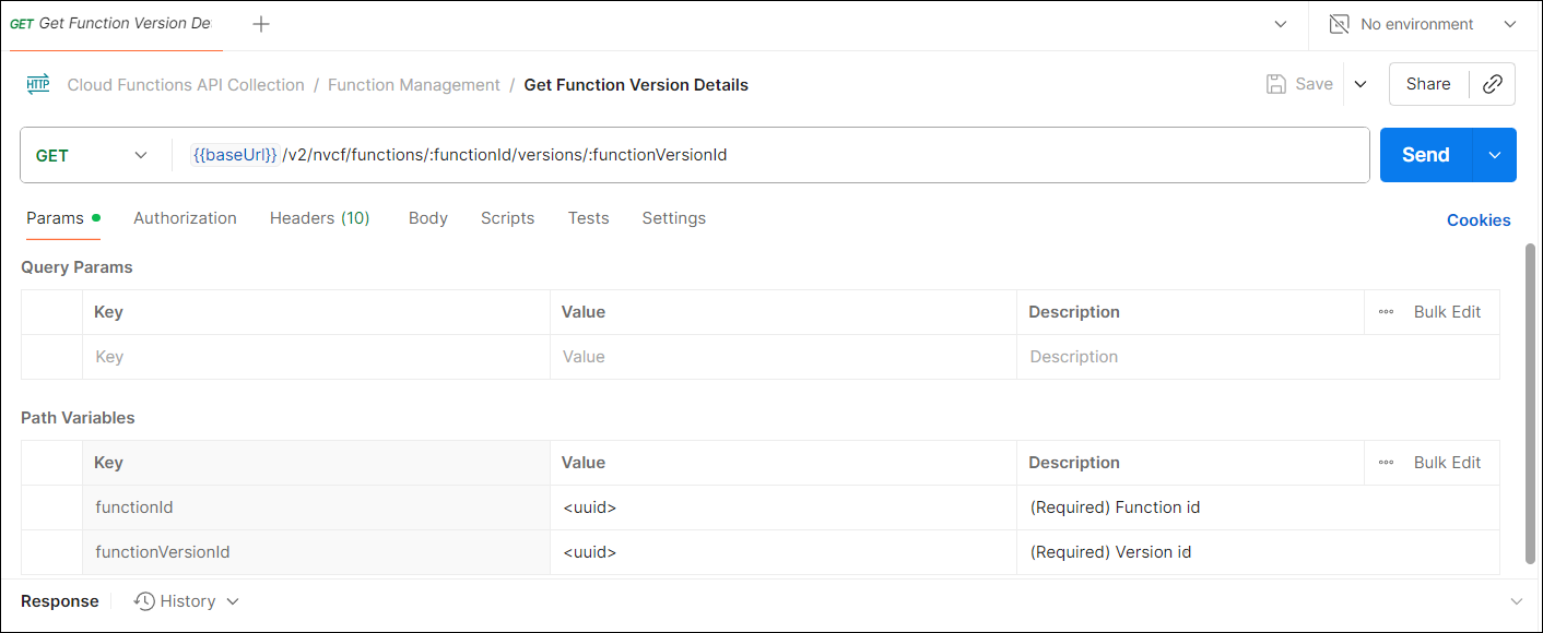 functionIdandfunctionVersionIdvalues for the function in question into the appropriate fields under the Path Variables section, then click Send to submit the query.In the body output, the