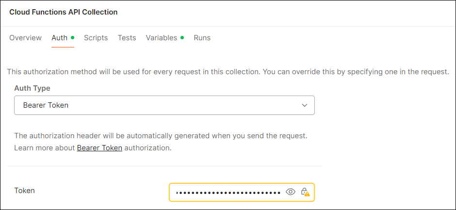 Ensure the Cloud Functions API Collection is selected, then click the Auth tab on the right. Keep the Auth Type as the default